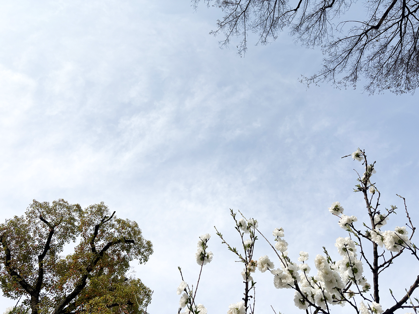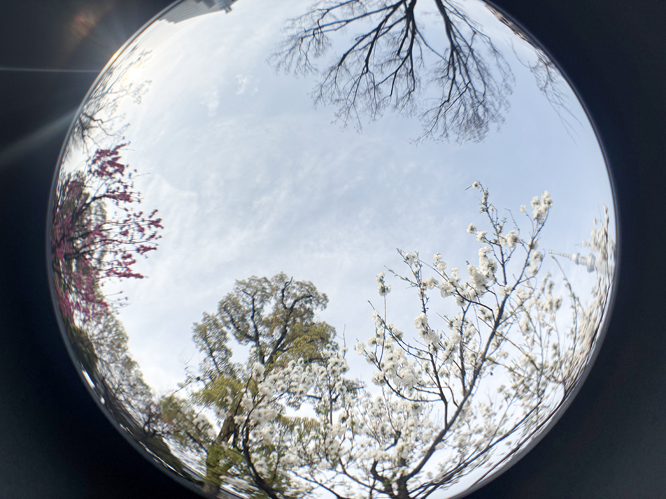 魚眼レンズ「EXAPRO クリップレンズ フィッシュアイ」は画角210°、倍率0.52倍※で広い画角が球形に写ります。作例は、木に囲まれた場所で空に向かって撮影したものです。空や海など広い空間の撮影に向いていますが、ペットの顔などをアップで撮って丸くしてもユニークな写真になります。