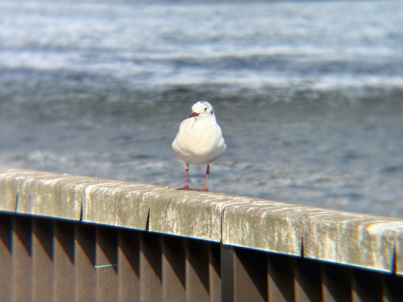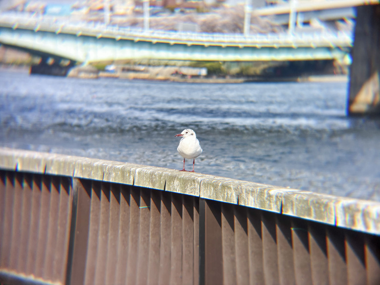 iPhoneの広角レンズ1.0倍で撮影した際には白い点のようにしか映らなかったものが、望遠レンズを付けて撮影するとユリカモメであることがわかります。スマホカメラの倍率を上げてさらに寄ると、表情も見えてきました。望遠レンズがあれば、スマホカメラでも野鳥撮影や遠方の建物などを撮れるようになります。