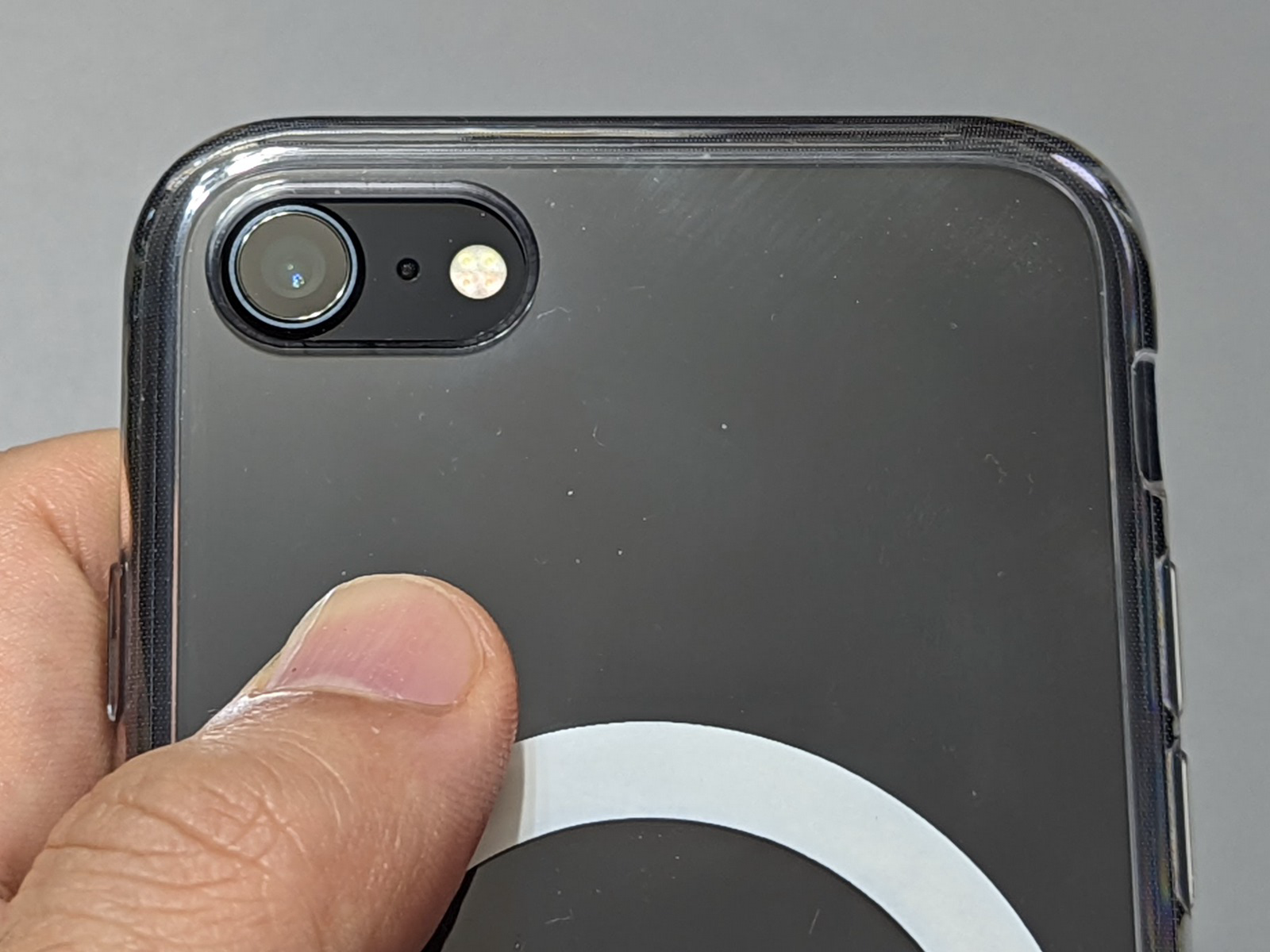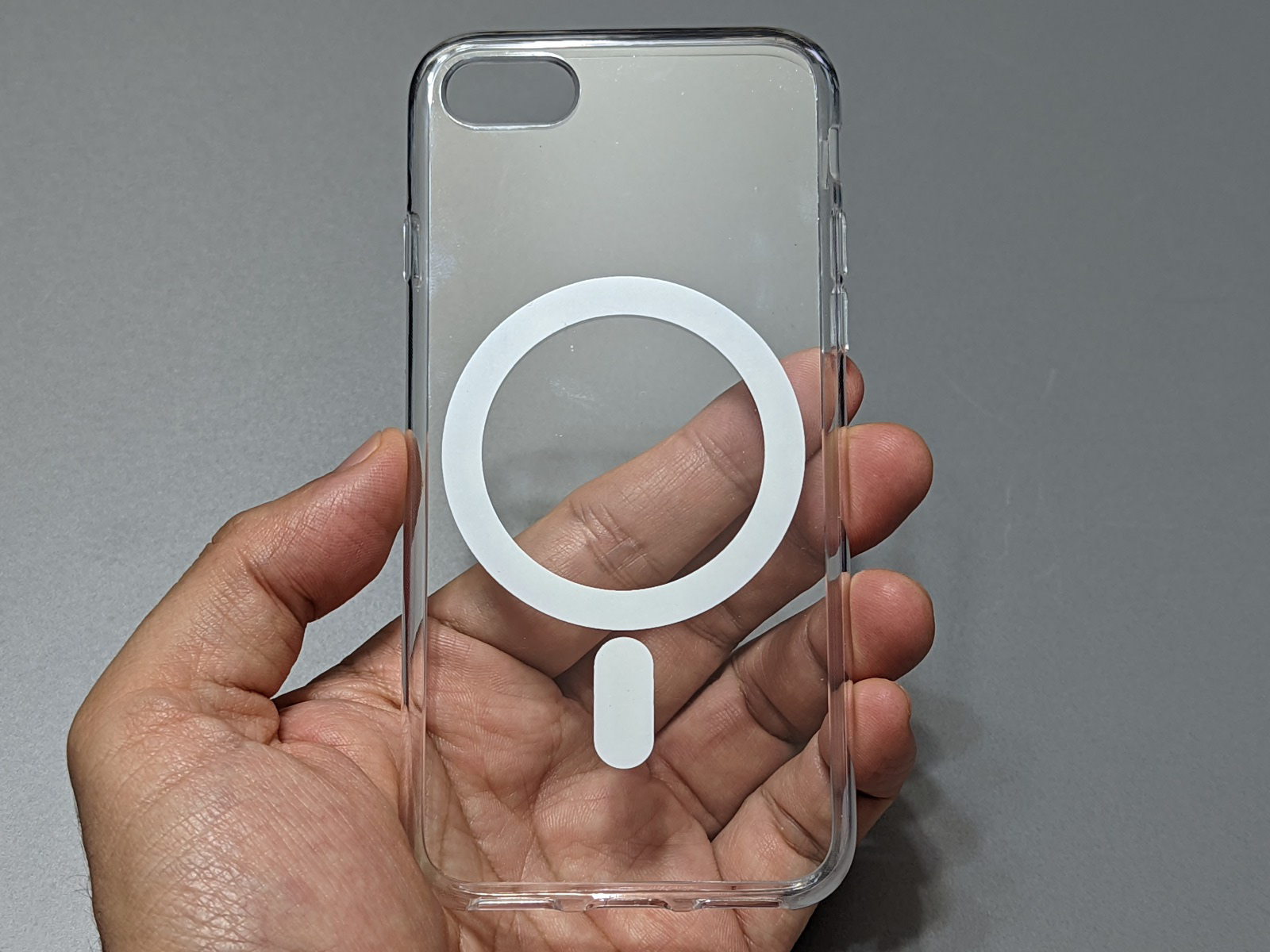 本製品は、側面が柔らかいGPU素材、背面がアクリル素材でできたハイブリッドタイプの透明保護ケースです。これだけならば市販の製品でもよくあるのですが、本製品の最大の特徴は、MagSafe互換のマグネットリングが、この背面に埋め込まれていることです。
