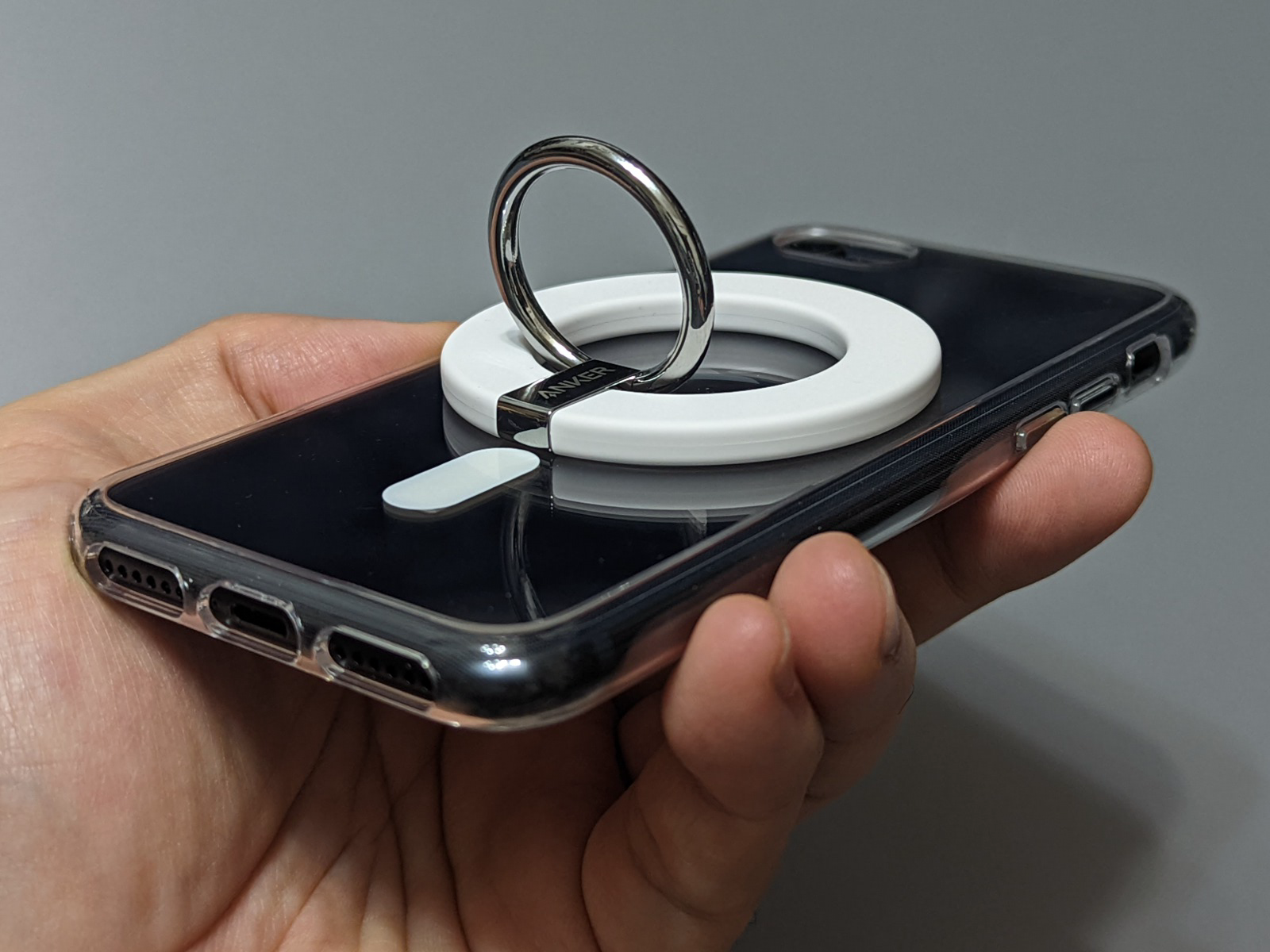 実際の吸着力は、試してみた限り、純正のiPhone 13と変わりません。今回は純正のMagSafe充電器のほか、Ankerが発売しているリングを試してみましたが、iPhone 13と同じように使えます。