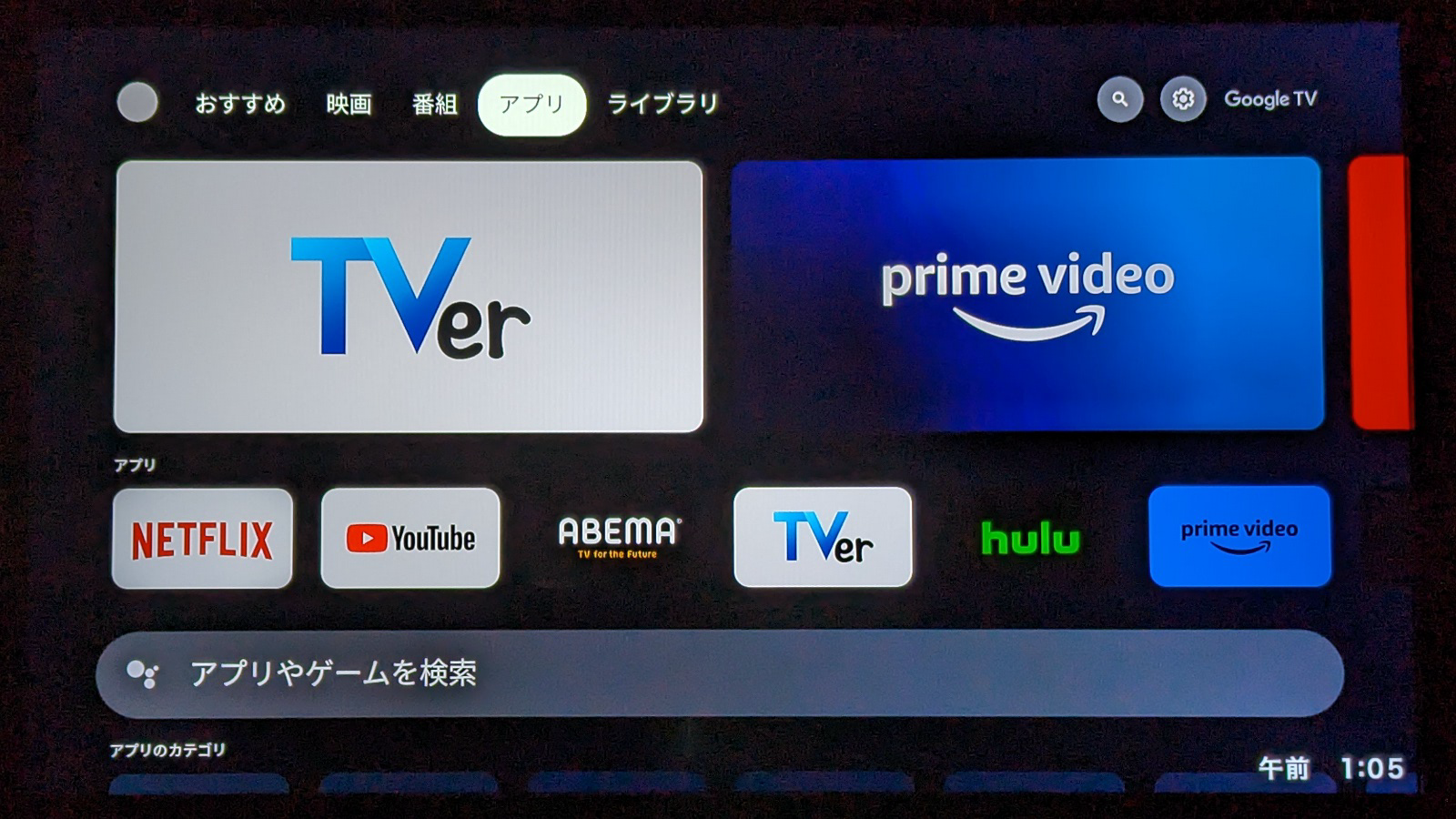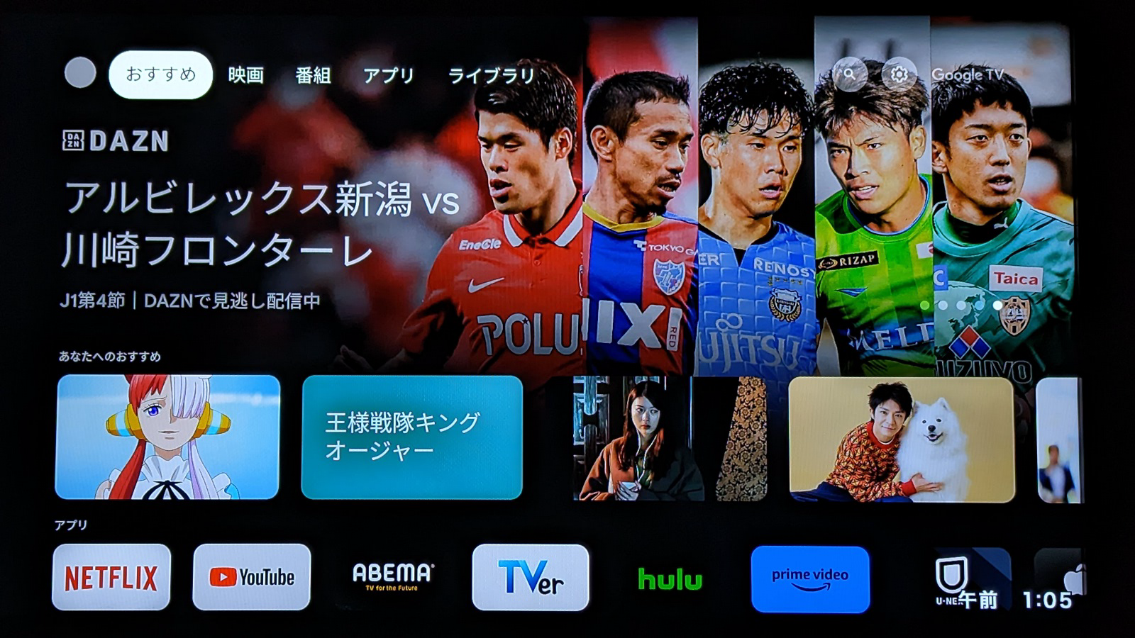 さて本製品の機能は、大きく2つに分けられます。ひとつは冒頭にも述べた動画配信サービスの視聴。本製品はYouTubeのほか、NetflixやAmazonプライムビデオといった動画配信サービスにも対応しており、大画面テレビでこれらを視聴できます。リモコン右上にあるボタンを使って音声による検索も行えます。