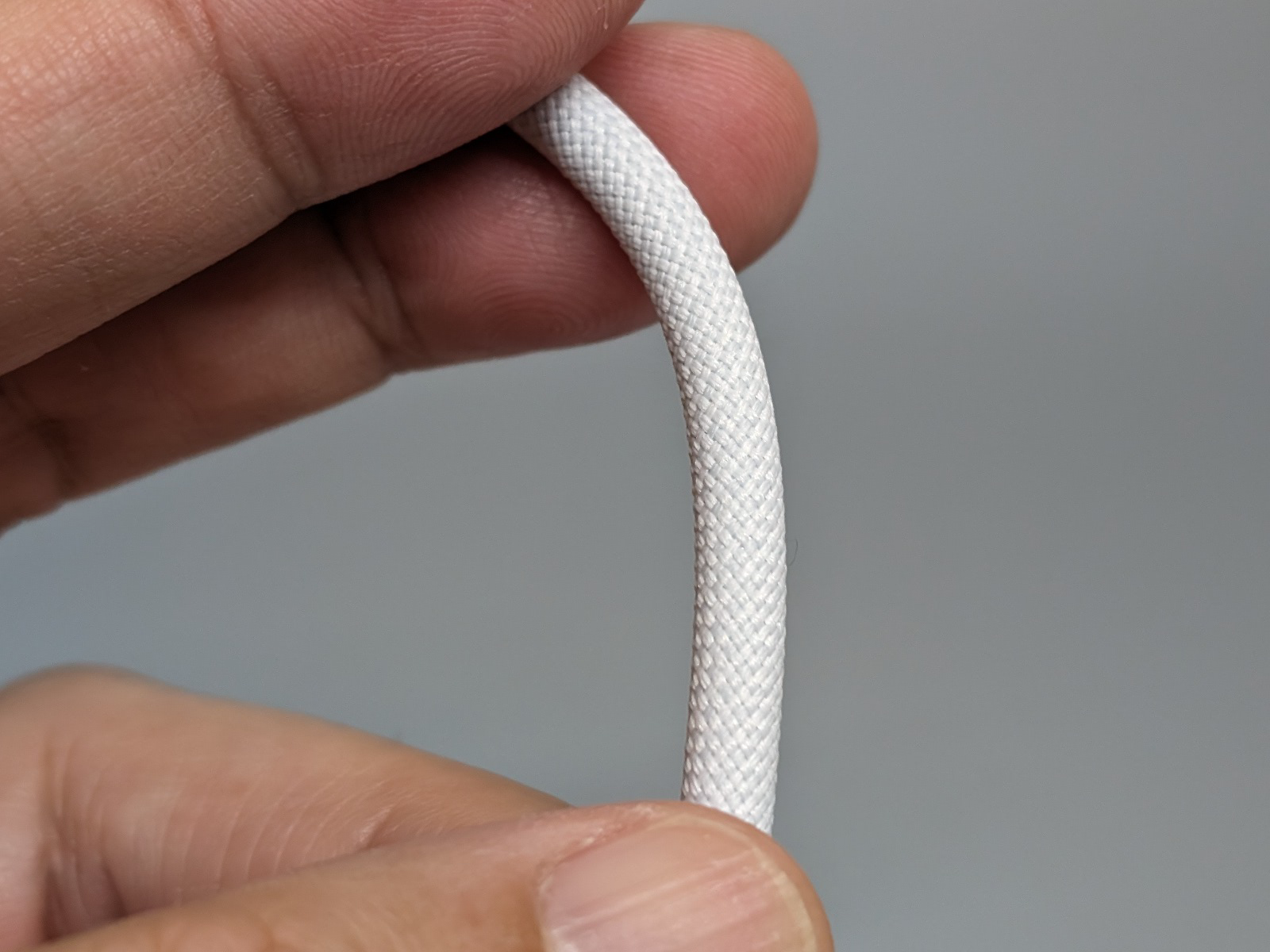 製品自体は、ケーブルの両端がUSB Type-Cという、見た目は何の変哲もないUSB Type-Cケーブルですが、手に取ってすぐわかるのは、ケーブルの表面がメッシュ状になっていることです。通常のビニールタイプの表面と異なり、折り曲げに強く、また汚れにくい特徴があります。