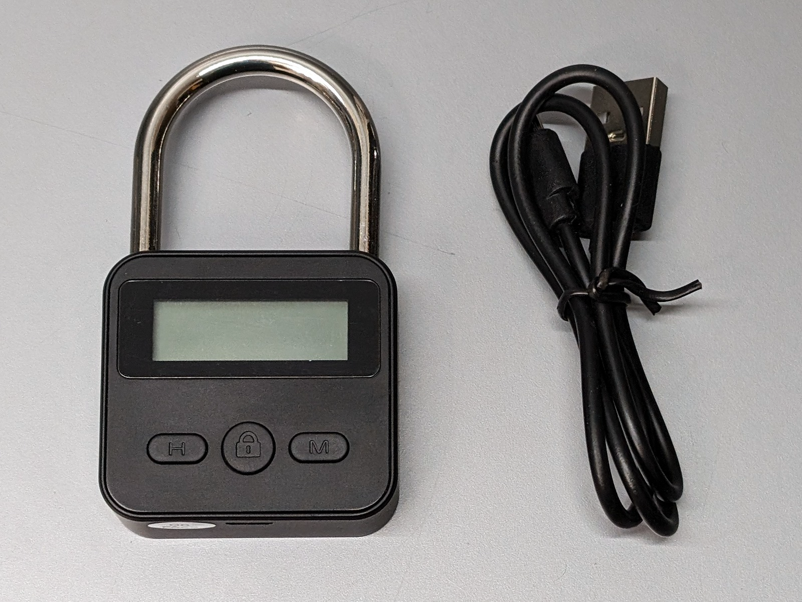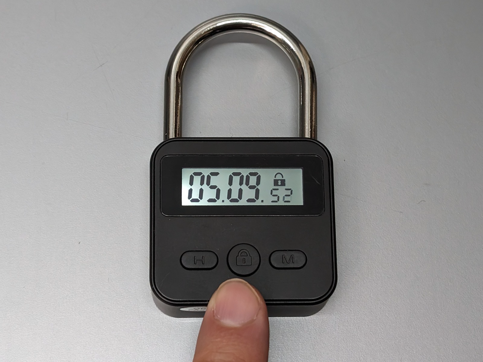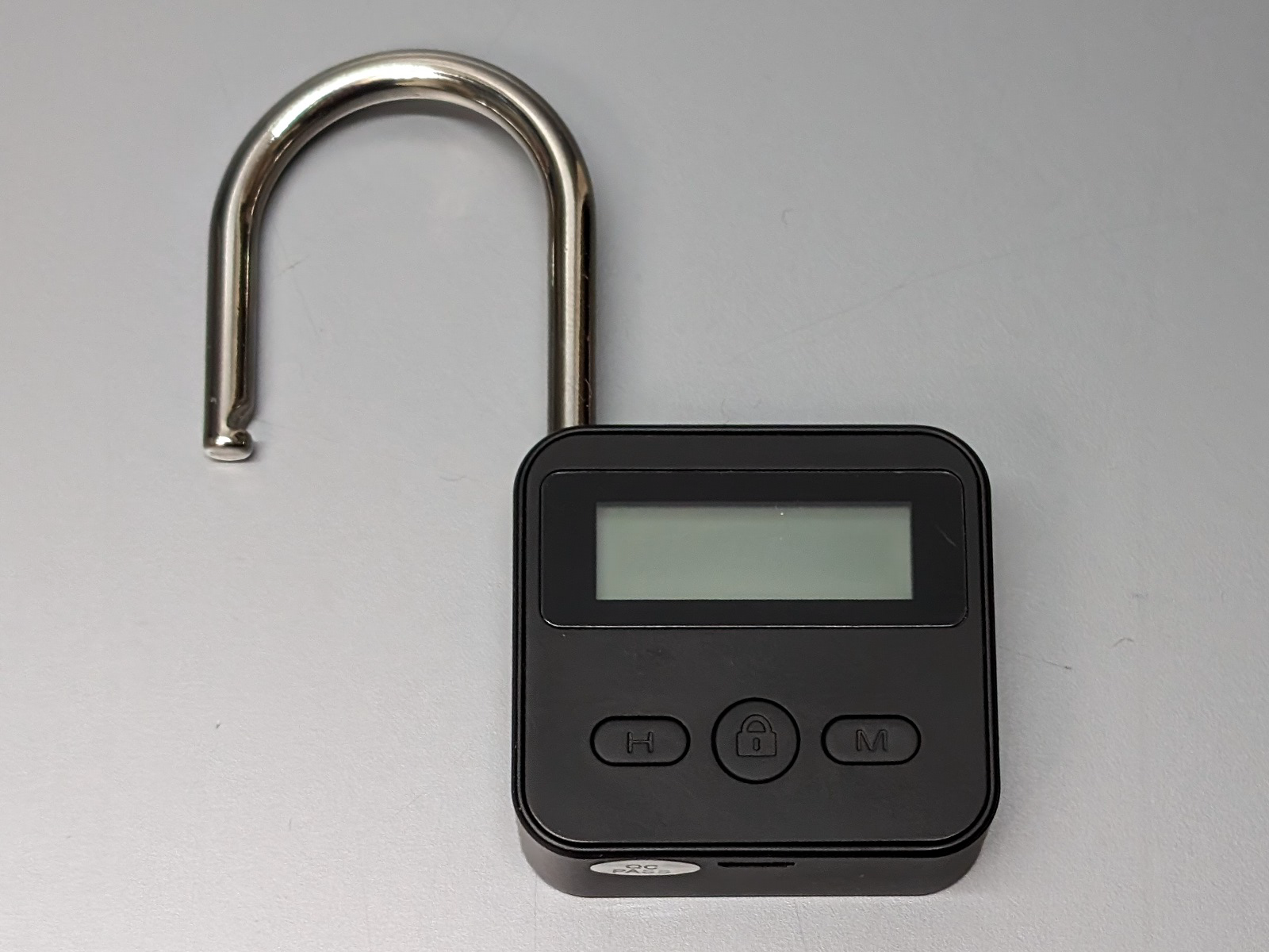 液晶画面の下には、時間と分を指定する2つのボタンに加えて、中央に鍵ボタンが用意されています。フックを挿入したあと中央の鍵ボタンを押すことによって、5秒のカウントダウンがスタートし、それが終わると完全ロックされます。カウントダウン中であれば鍵ボタンを押すことで解錠できますが、それを過ぎると、残り時間がゼロになるまでは、決して開けられない仕組みです。