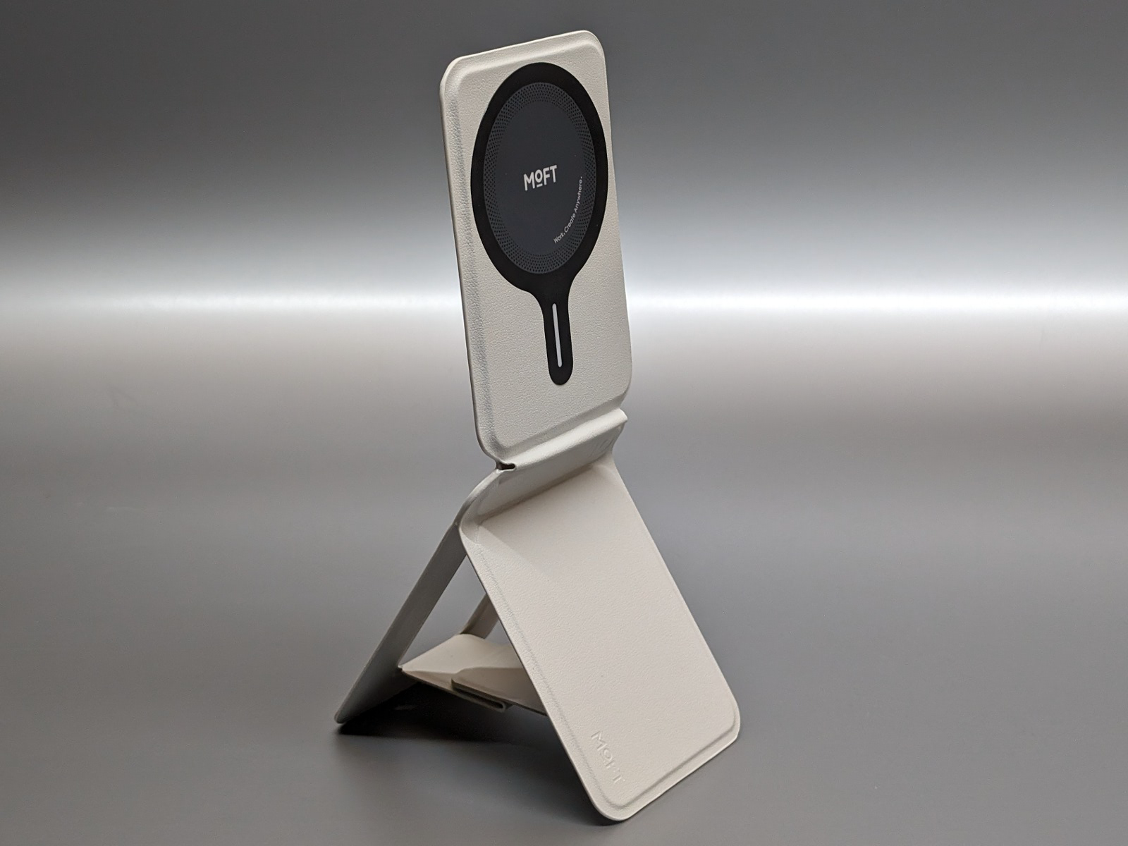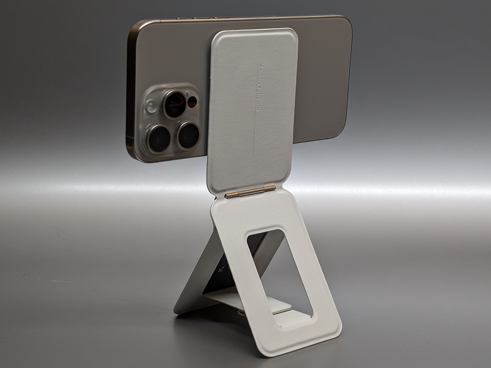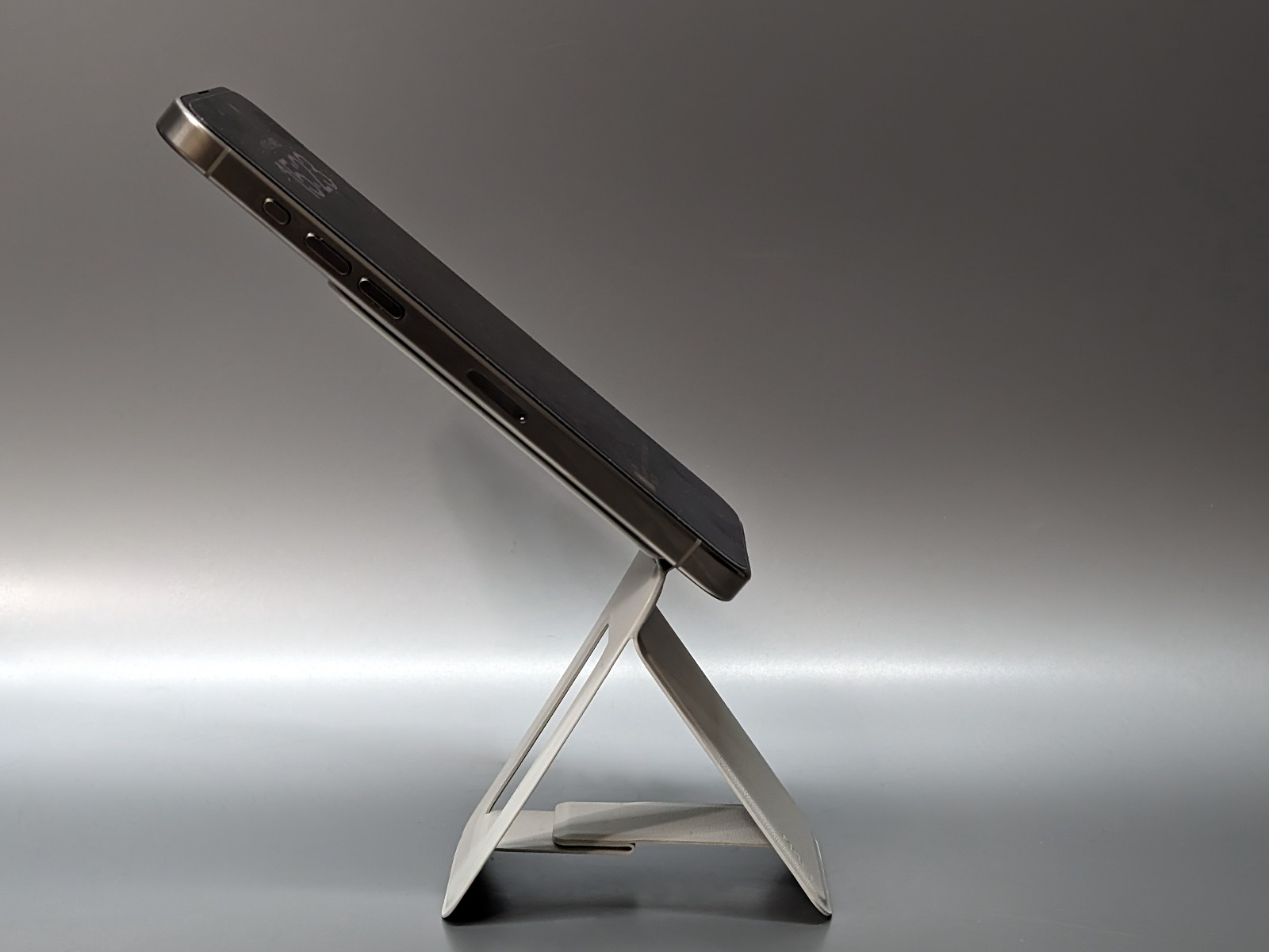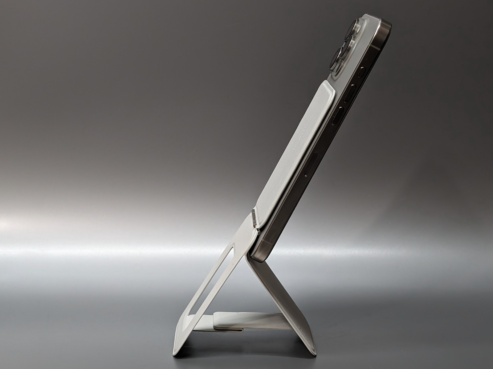 これだけならば一般的なMagSafe対応のスタンドと変わりはないのですが、本製品は底面をさらにもう1段階展開することによって、iPhoneを持ち上げて立てることができます。