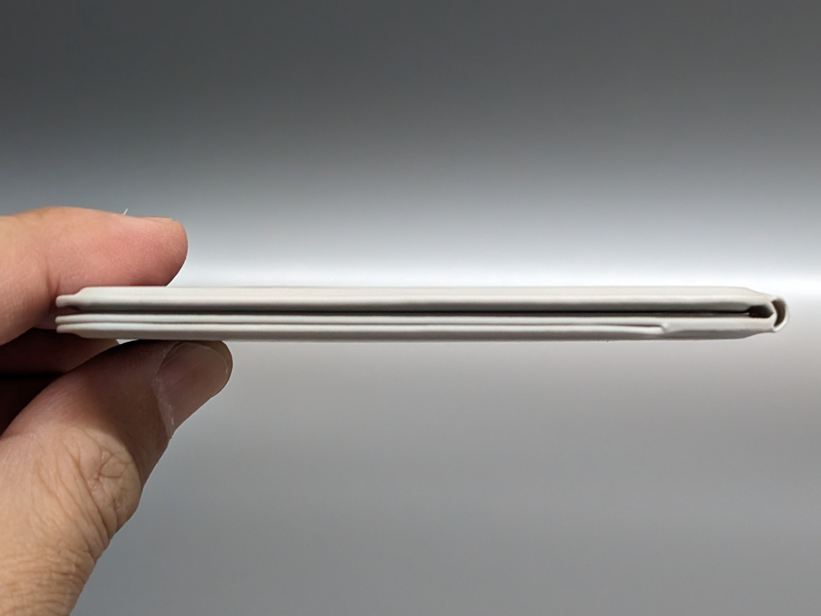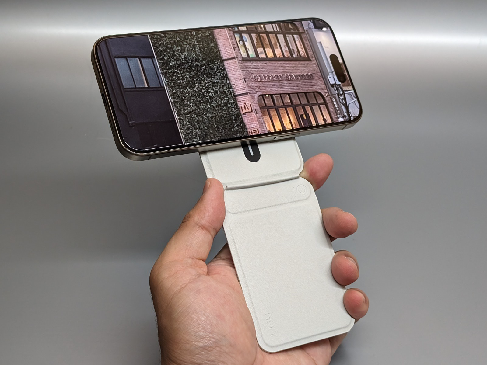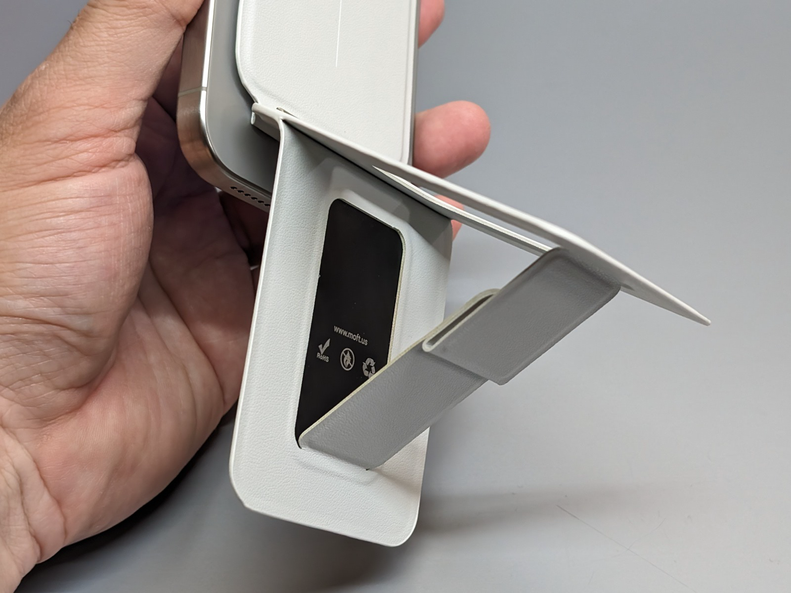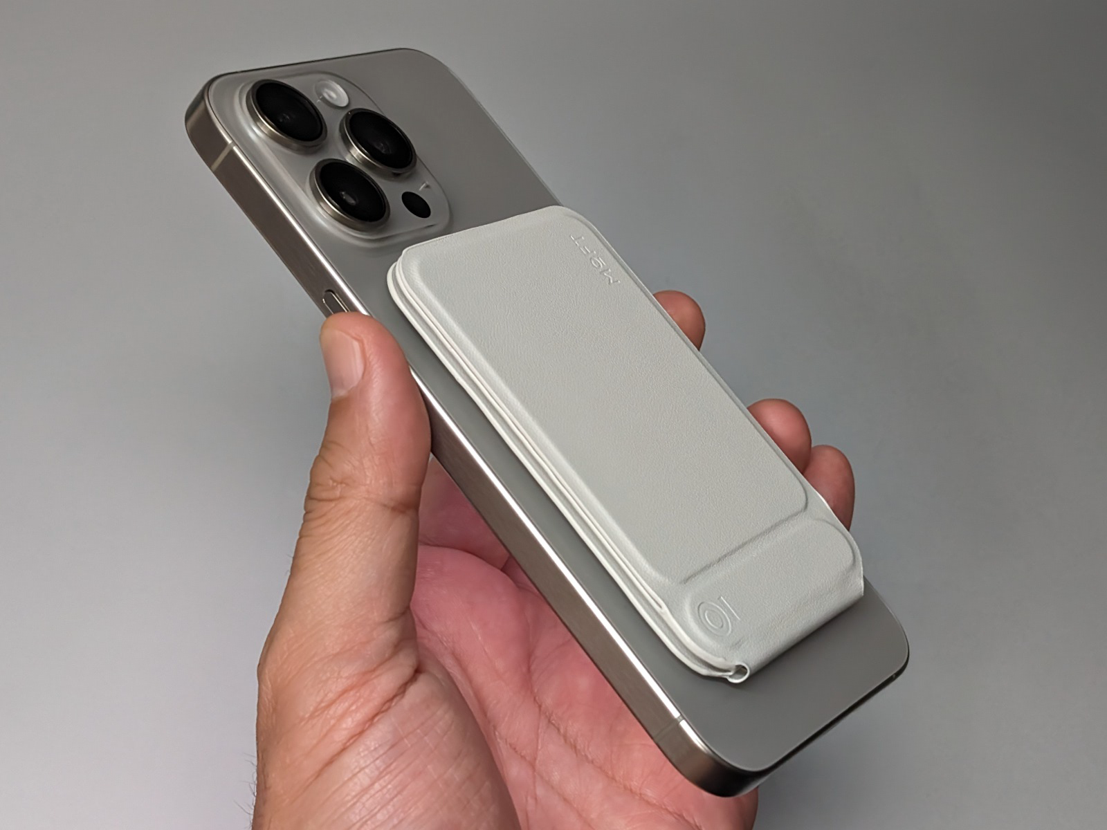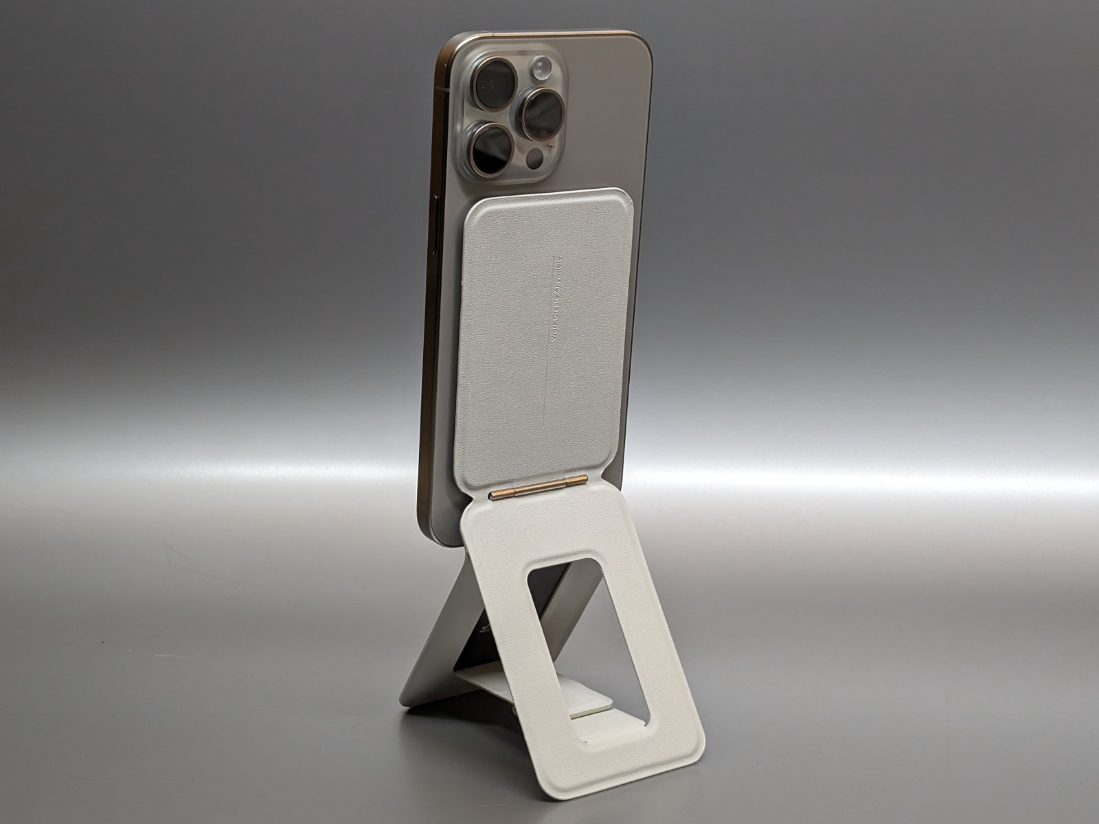 もうひとつは重量です。本製品をたたんだ状態のサイズはクレジットカードとほぼ同等、厚みもせいぜいクレジットカード2~3枚分なのですが、強度の高いヒンジや、マグネットを内蔵しているせいか、重量は実測90gもあります。現行のiPhoneは200g前後なので、取り付けると重量は1.5倍ほどになります。保護ケース程度ではあまり気にならなくても、本製品の重さはちょっと厳しいと感じる人は少なくないでしょう。