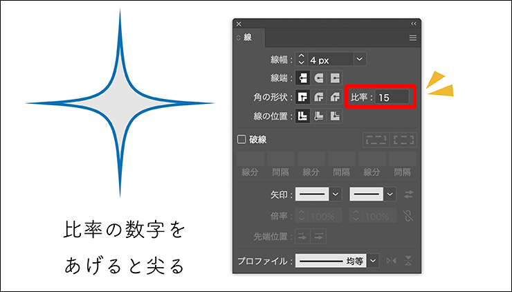 そんなときは、ウィンドウメニュー→“線”で線パネルを表示して、[比率]の数字を上げると角が尖ります(図6)。
