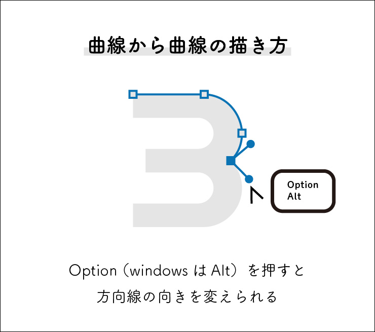 数字の3は曲線から曲線の箇所があります(図15)。こういう場合は、ドラッグで方向線を伸ばした後、optionキー(Macの場合。WindowsではAltキー)を押しながら方向線を移動させて、曲線から曲線を描きます(図16)。コツは「曲線を伸ばしたい方向に方向線を伸ばす」ことです。
