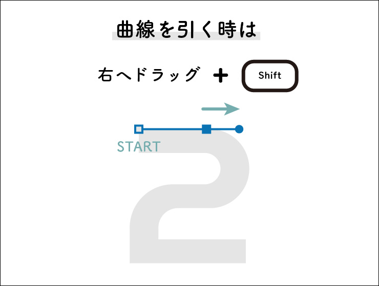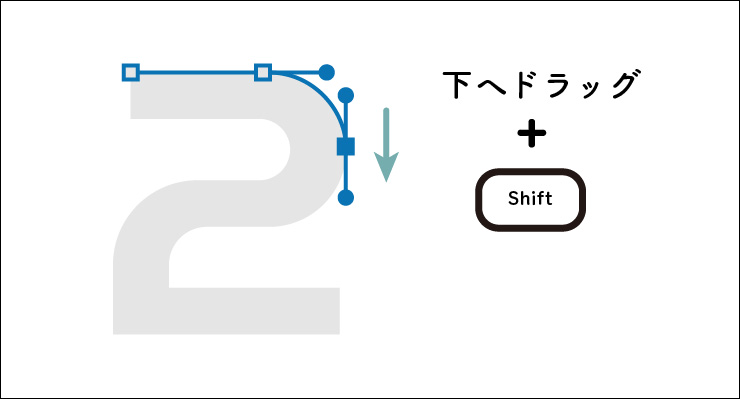 次は曲線の練習として数字の2をトレースしてみましょう(図10)。左上をスタート地点として、一度クリックして直線を描いたら、カーブの始まる点で右へドラッグします。このときドラッグしたまま指を離さずshiftキーを押して、水平方向にハンドルを伸ばします。
