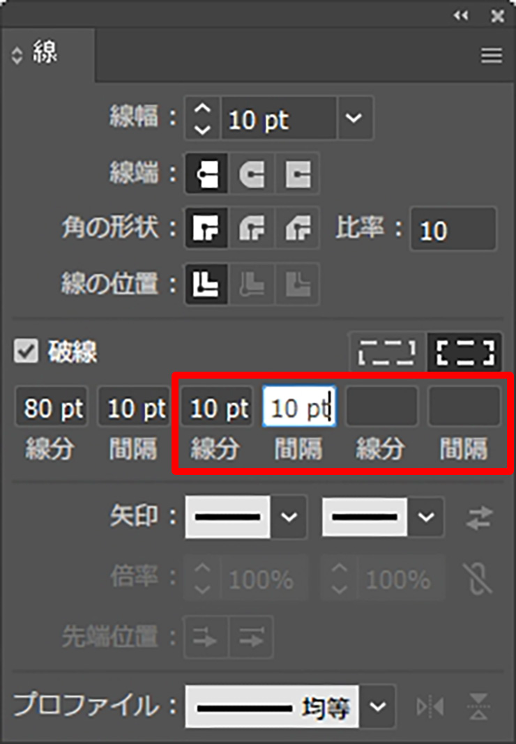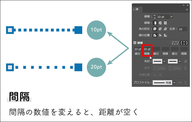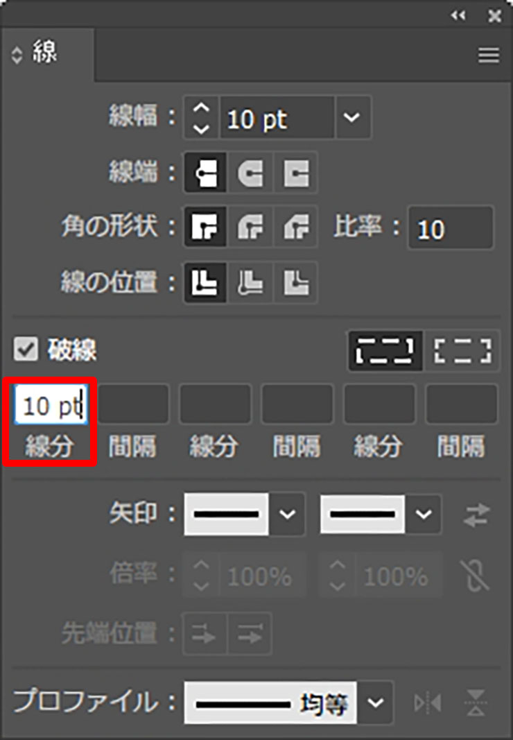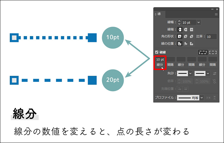 点線・破線の形や間隔は線パネルで変更できます。点線の点の長さは[線分]で調整します(図5)。長くしたい場合は、数値を上げます(図6)。