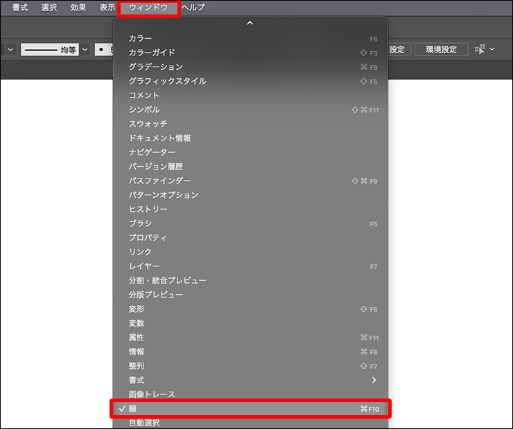 ペンツールや直線ツールなどで描いた線は、線パネルの設定で点線にできます(図1)。線パネルは、ウィンドウメニュー→“線” で表示します(図2)。