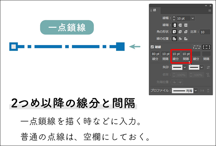 2つ目以降の[線分]と[間隔]は一点鎖線や二点鎖線などを引く場合に設定します(図9)(図10)。普通の点線でよければ空欄で構いません。