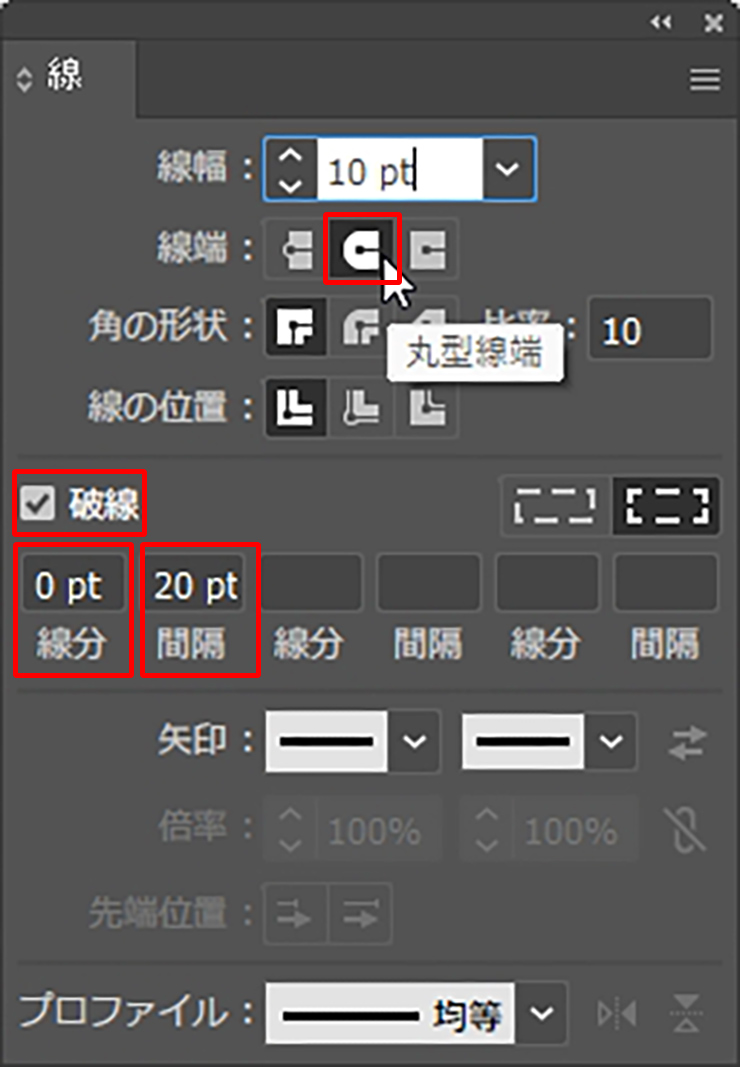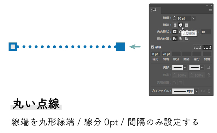 丸い点線も線パネルの設定で作ることができます。[線端:丸型線端]を選択すると線の端が丸くなります。この状態で[破線]にチェックを入れ、[線分:0pt]、[間隔]に任意の数値を入力すると丸い点線になります(図11)(図12)。
