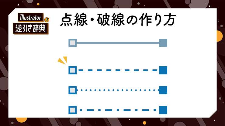 Illustrator(イラレ)で、点線・破線・丸い点線の作り方を紹介します。点線・破線は「線パネル」の設定で作ります。線(ライン)の設定は、Illustratorの基本操作の1つなので、押さえておきましょう。