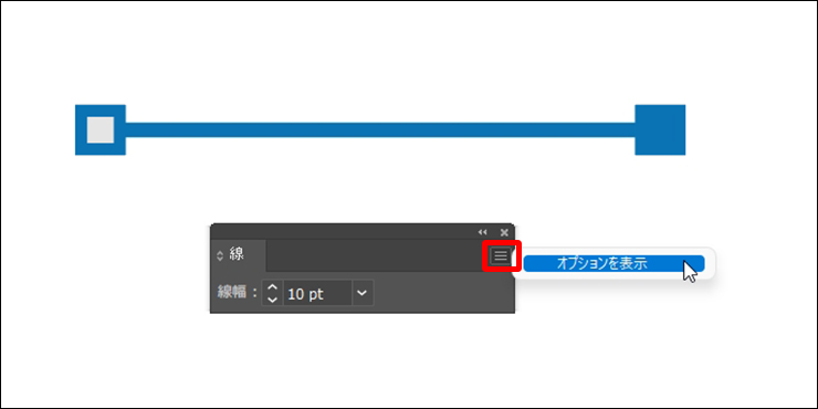 線パネルに[破線]の項目が見当たらない場合は、パネルの右上のメニューのアイコンをクリックして、表示された[オプションを表示]をクリックします(図3)。あとは、[破線]にチェックを入れると、線が点線に変化します(図4)。