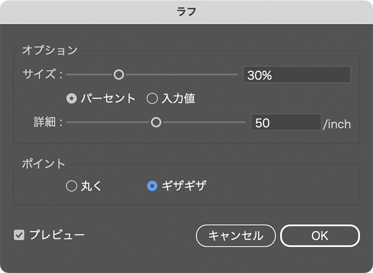 この円を選択した状態で、効果メニュー→“パスの変形”→“ラフ...”をクリックして、表示されたダイアログで集中線の外観を決めていきます。