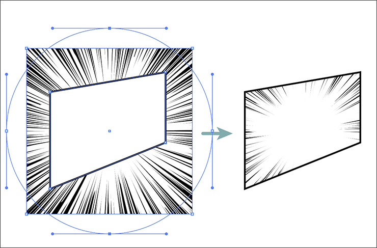 続いて、作成したすべてのオブジェクト(ここでは、切り取りたい形で作った図形/[ラフ]を適用した円/黒の四角のこと)を選択して、オブジェクトメニュー→“クリッピングマスク”→“作成”を適用。これで好きな形に切り抜かれた集中線の完成です(図5)。