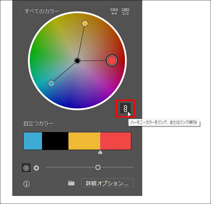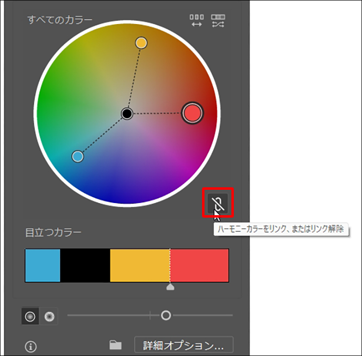 操作は簡単で、カラーホイールの右下のリンクマークにチェックを入れて(図4)、カラーホイールを回転するようにハンドルをドラッグすると、バランスよく色味を置き換えることができます(図5)。