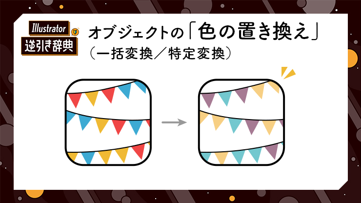 Illustrator(イラレ)で、オブジェクトの色を置き換える方法について解説します。複数のオブジェクトの色を一括で置き換える「オブジェクトを再配色」機能と、特定の色だけを置き換える「選択」機能をそれぞれ解説。使用頻度の高い必須の操作ですので、ぜひ覚えましょう。
