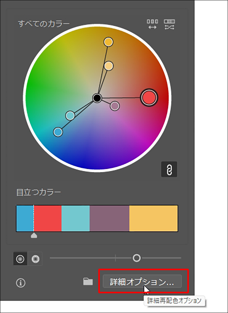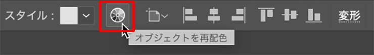 もしくは、上部のパネルの少し右側、色相環のマーク[オブジェクトを再配色]でも、[オブジェクトを再配色]ダイアログを開くことができます(図3)。