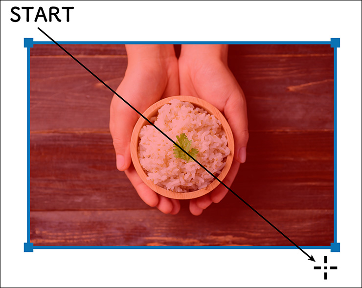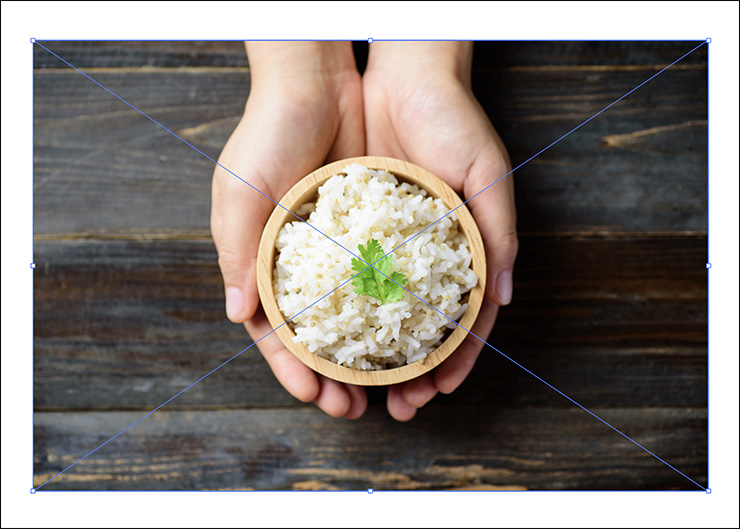 次に長方形ツールを選択して、画像と同じサイズの長方形にして重ねます(図2)。※下図では配置がわかりやすいように長方形の塗りをあえて半透明の赤にしていますが、通常は不透明度を下げる必要はありません。画像の前面に長方形を配置するのがポイントです。