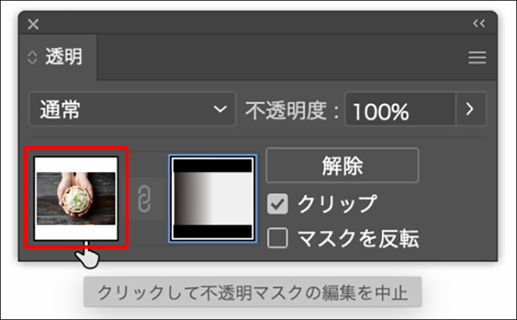 ちなみに、不透明マスクの編集中は、通常のオブジェクトにはさわれなくなるので注意が必要です。通常のオブジェクトを編集するときは、透明パネルのオブジェクトの部分([クリックしてク不透明マスクの編集を中止])をクリックしましょう(図10)。
