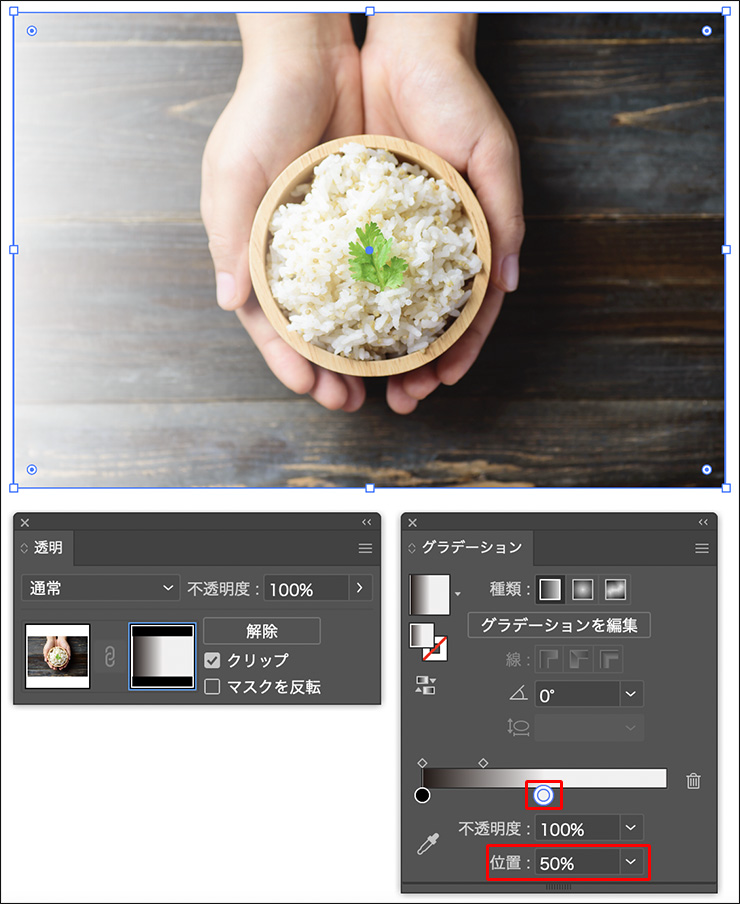 たとえば、白のグラデーションスライダーを選択して、[位置:50%]にすると(もしくはスライダーを左に動かす)、不透明マスクの位置が変わり、グラデーションのかかり具合も変わります(図8)。