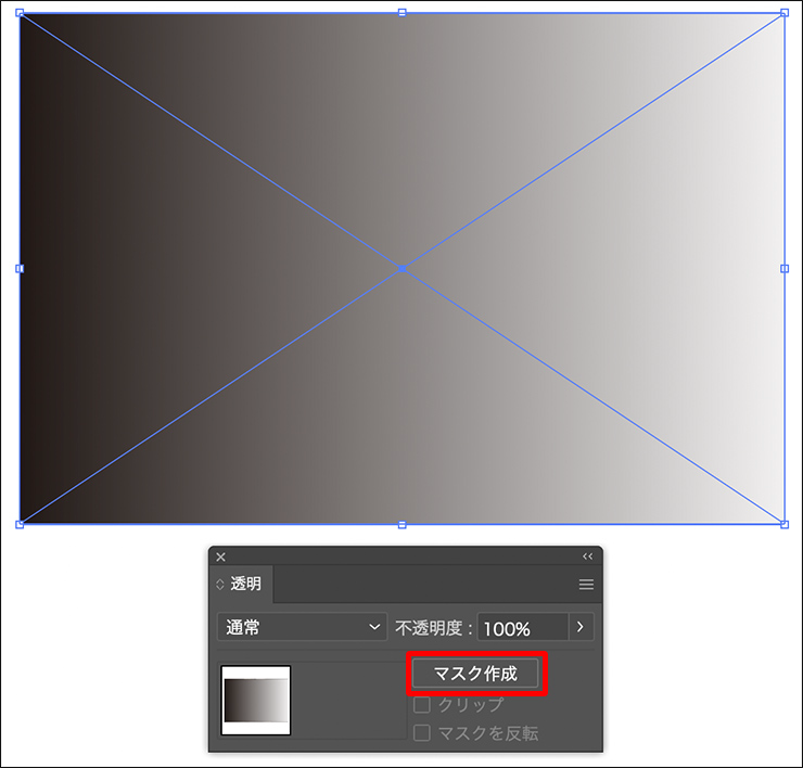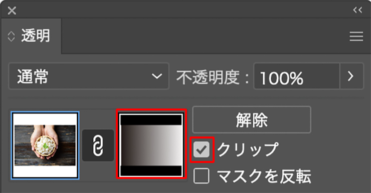 不透明パネルの[クリップ]にチェックを入れ、白黒のグラデーションのマークをクリックしておくと、不透明マスクを編集できます(図7)。