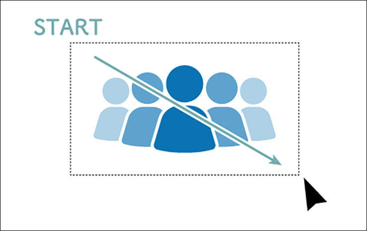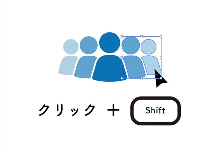 オブジェクトをグループ化したい場合は、まずはグループにしたいオブジェクトをすべて選択します。複数のオブジェクトを選択する方法は、オブジェクトをドラッグで囲むか(図1)、shiftキーを押しながらオブジェクトをクリックします(図2)。