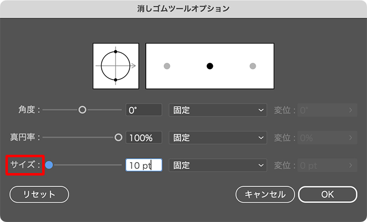 消去する幅は、消しゴムのサイズで決まります。消しゴムのサイズは、キーボードの「 ] 」キーで拡大、「 [ 」キーで縮小します。または、消しゴムツールをダブルクリックして、「消しゴムツールオプション」ダイアログの[サイズ]でも調整できます(図3)。