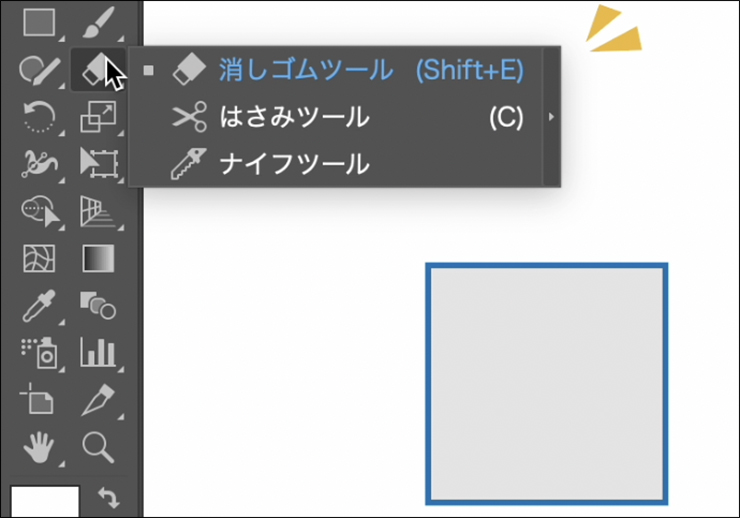 ツールバーで「消しゴムツール」のアイコンを長押しすると「はさみツール」「ナイフツール」が表示されます(図1)。長押しをしてもナイフツールが表示されない場合は、ウインドウメニュー→“ツールバー”→“詳細”にチェックを入れ、詳細ツールバーにして表示します。