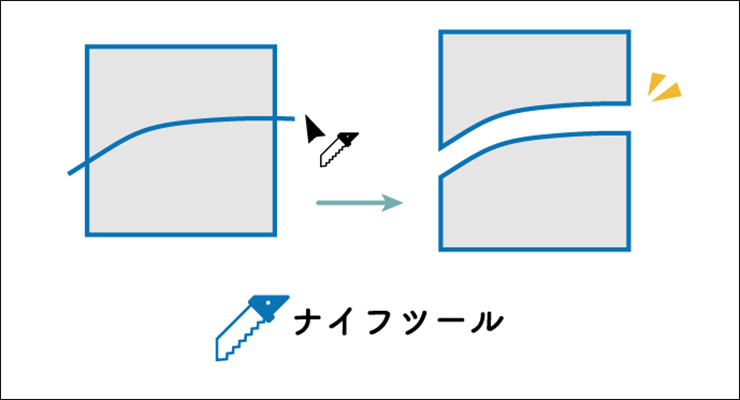 ナイフツールを選択して、オブジェクト上をドラッグすると、切り込みを入れた状態となり、ドラッグしたライン(ドラッグの軌跡)でオブジェクトを分割できます(図6)。