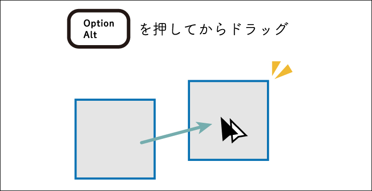 ドラッグの途中で、optionキー(Macの場合。WindowsではAltキー)を離してしまうと複製できません。「移動前にoptionキーを押し始めて、移動後に離す」と意識しましょう。