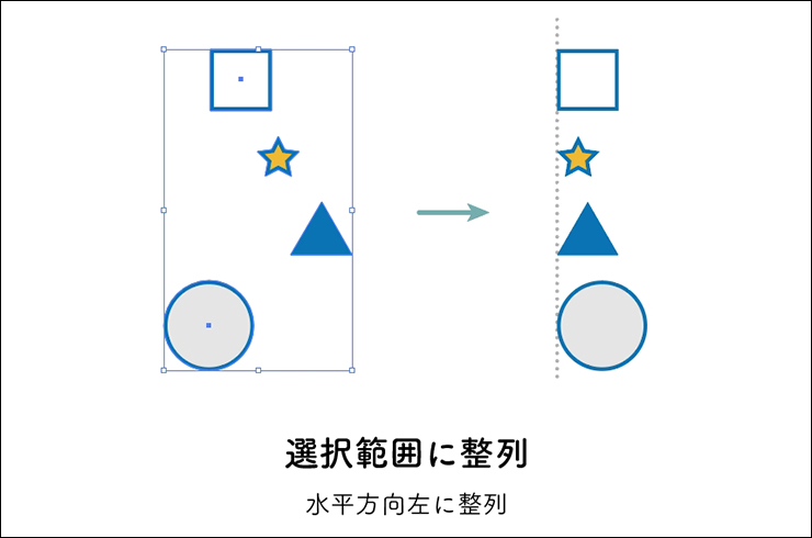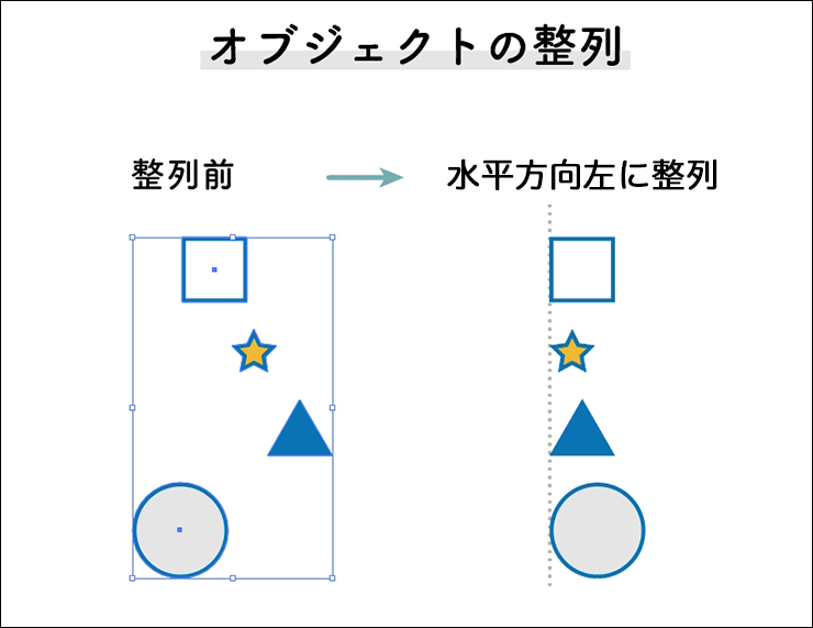 たとえば、選択ツールで整列したいオブジェクトをすべて選択して、[水平方向左に整列]をクリックすると、一番左のオブジェクトの位置を基準として、左揃えの整列となります(図3)。