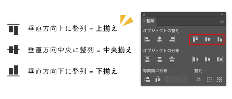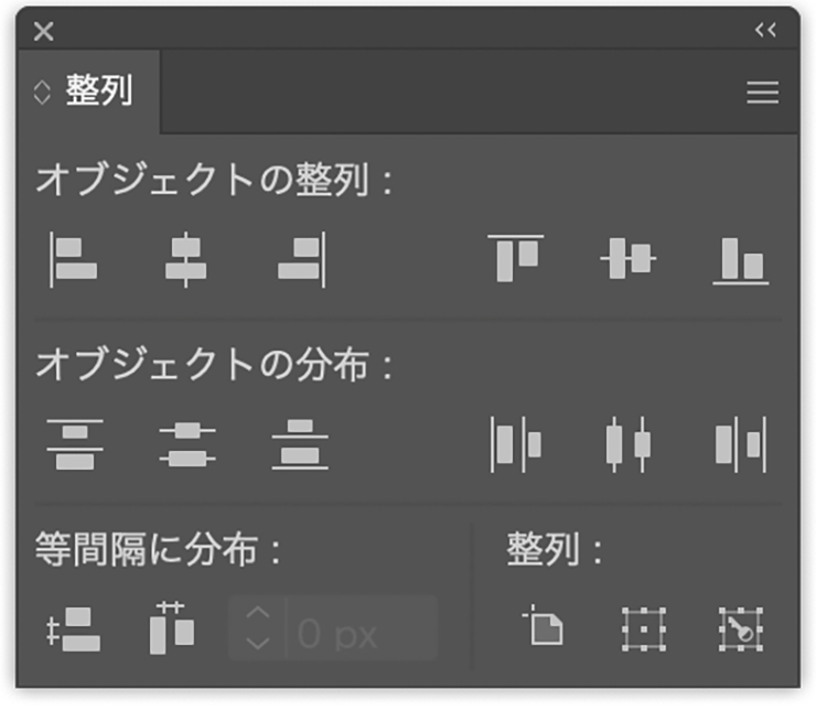 ※なお整列パネルの右下の[整列]は、[選択範囲に整列]を選択しています。以下も同様。詳しくは後述しますが、どこを基準にして整列させるかを選択することもできます。