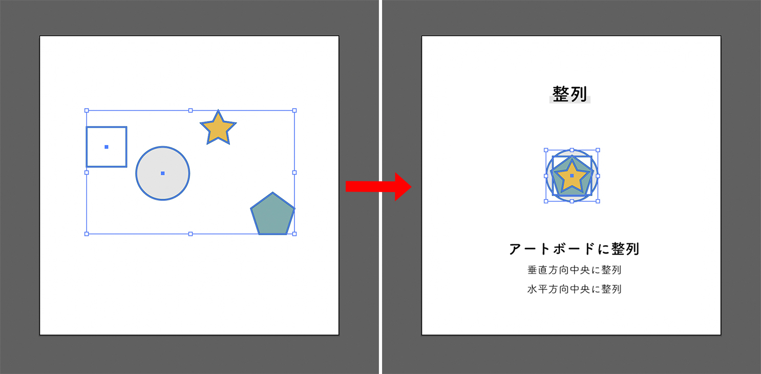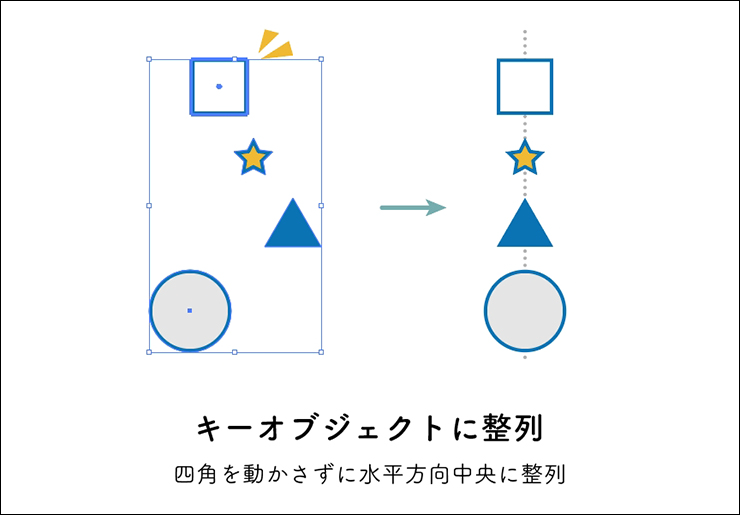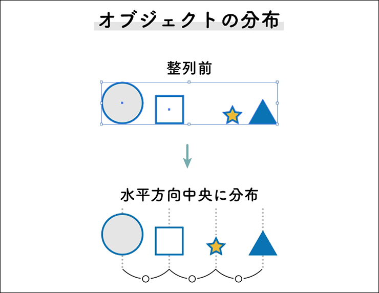 ■使用する機能「整列パネル」「オブジェクトの整列」「オブジェクトの分布」「等間隔に分布」「アートボードに整列」「選択範囲に整列」「キーオブジェクトに整列」