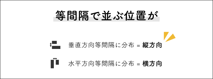 整列パネル下段の「等間隔に分布」は、オブジェクトからオブジェクトまでの距離を等間隔に整列できます。それぞれのオブジェクトのサイズが異なっていても、均等な距離になるため整った印象になります。これも水平方向・垂直方向があります(図8)(図9)。