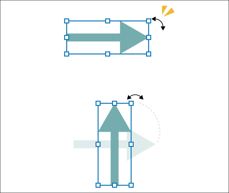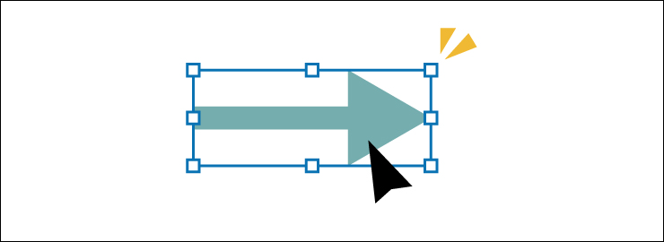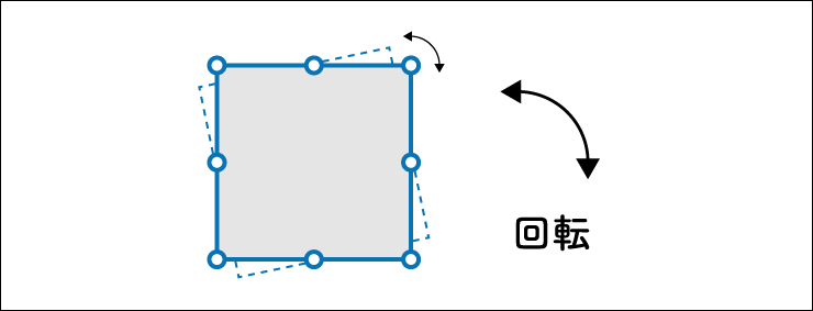 「自由変形ツール」を使うと回転のほか拡大縮小、傾斜をつけるなどの変形も同時に行うことができます(図8)。回転の方法は、バウンディングボックスを使った操作と同じで、オブジェクトの外側にカーソルを合わせドラッグするだけです(図9)。自由変形ツールに関しては、「図形の形を変える/好きな形・自由な形にする」で、詳しく解説していますのでそちらをご覧ください。