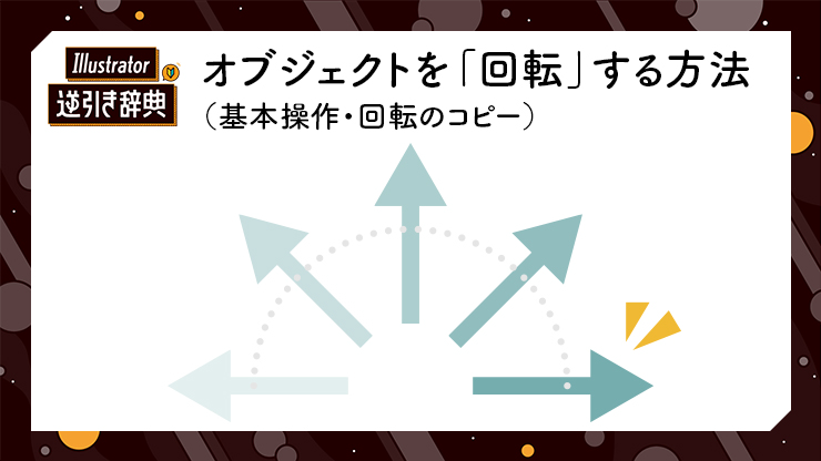 Illustrator(イラレ)で、オブジェクトを回転させる方法を解説します。オブジェクトの回転の基本操作、「選択ツール→バウンディングボックス」と、「回転ツール」を使う方法をそれぞれ解説。そのほか回転するオブジェクトのコピー、「自由変形ツール」の回転も紹介します。
