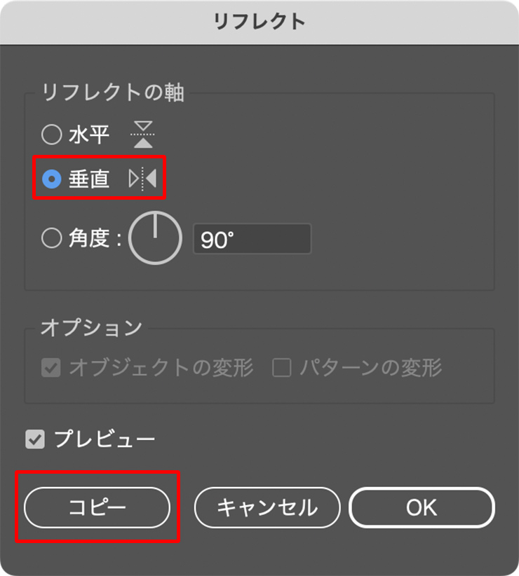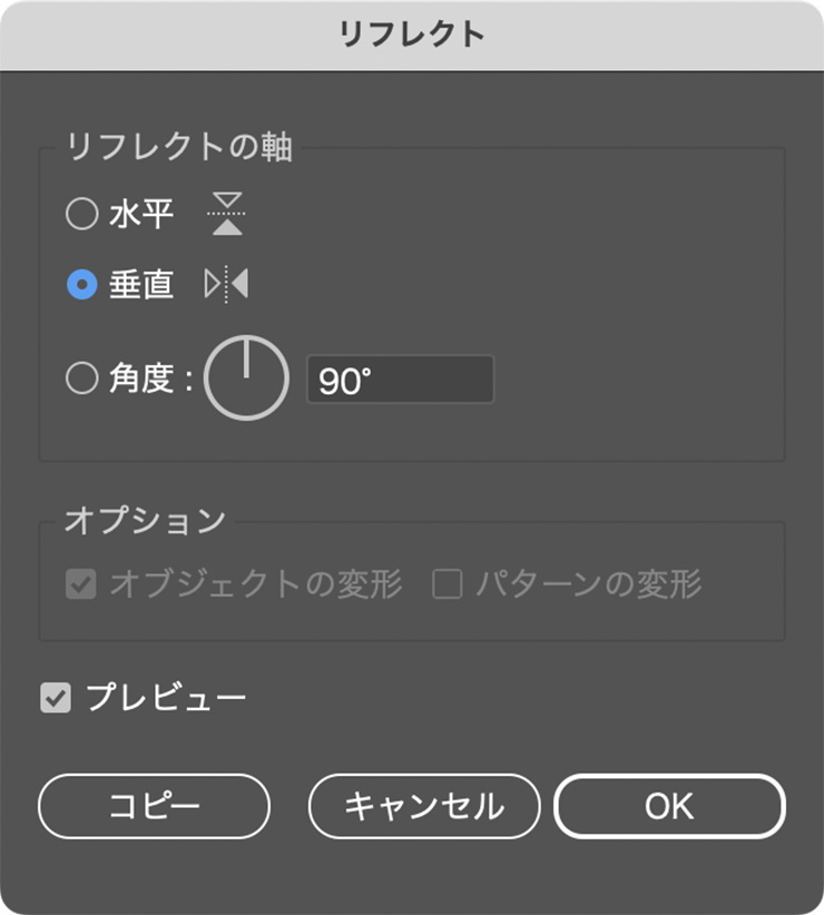 「どちらの方向に反転させるか?」を決めるのが、[リフレクトの軸]です。もしオブジェクトを上下に反転させたいなら[水平]を、左右に反転させたい場合は[垂直]を選択してOKをクリックします(図3)。