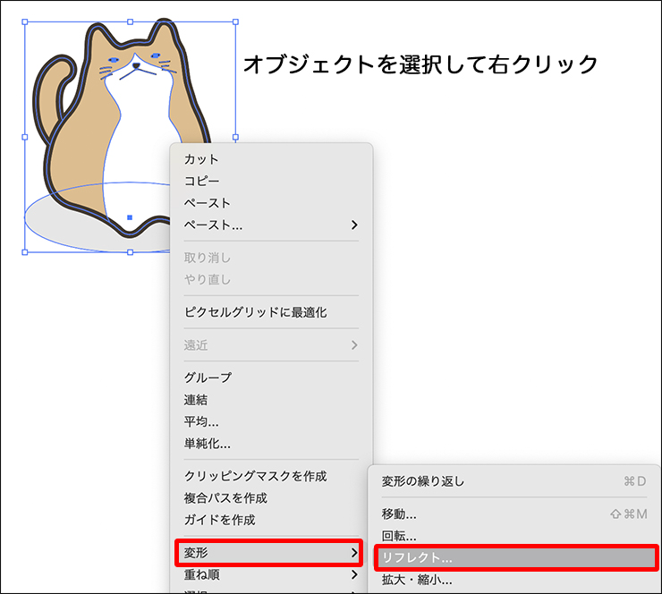 たとえば、右向きで作成していたイラストやオブジェクト(図形)を左向きにしたい場合など、単純に左右を反転させたいときは、選択ツールでオブジェクトを選択した後、右クリック→“変形”→“リフレクト...”をクリックして(図1)、表示されたダイアログの[リフレクトの軸]のいずれかを選択して反転させます(図2)。