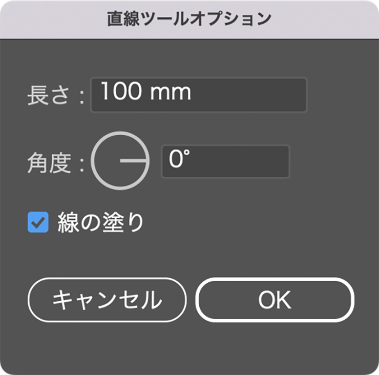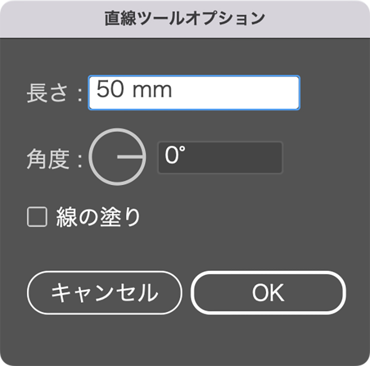 アートボード上の線を引きたい場所をクリックすると「直線ツールオプション」ダイアログボックスが表示されるので、[長さ]と[角度]に任意の数値を入力して適用します(図4)。
