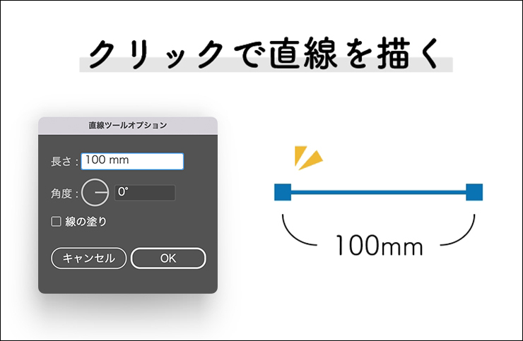 たとえば、[長さ:100mm]、[角度:0°]と入力して適用すると、正確に100mmの水平線を描くことができます(図5)。