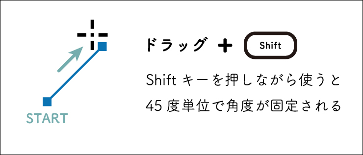 shiftキーを押すことで、0°、45°、90°といったように45°ごとに角度がロックされます。たとえばshiftキーを押しながら横方向にドラッグすると、多少手ぶれで線の終点が真横からずれてしまってもきれいな水平線が描けます。上方向にドラッグ+shiftキーなら垂直線が描けます。斜め方向ならきっちり45°の線になります(図3)。