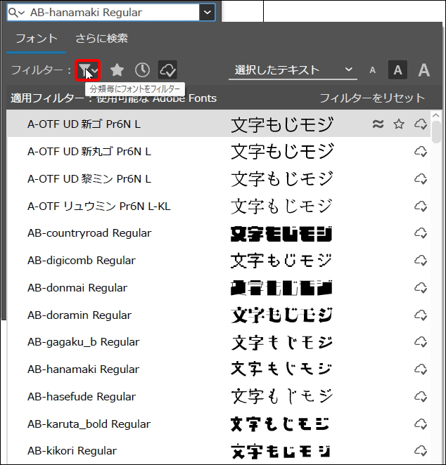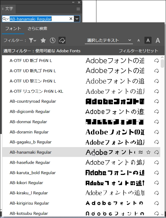 文字パネルで書体名横のプルダウンメニューから“フォントファミリを設定”を開き(図14)、[フィルター]の雲のマーク[アクティベートしたフォントを表示]をクリックすると(図15)、Adobe Fontsで追加したフォントが表示されます(図16)。
