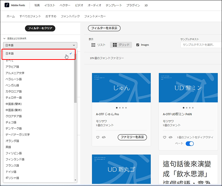 日本語フォントを探す場合は、[言語および文字体系]で[日本語]を選びます(図6)。英語のアルファベットであれば[英語]を選択します。