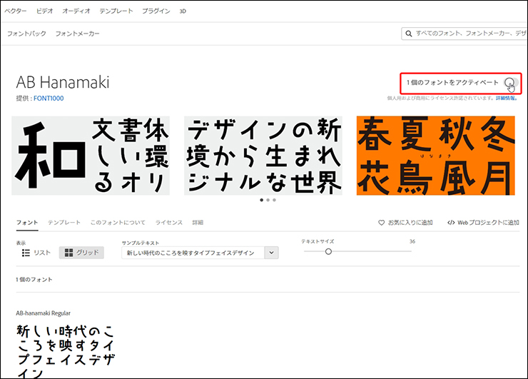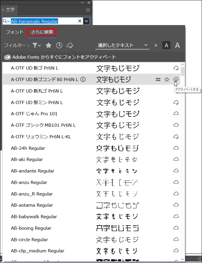 するとフォントファミリー(同じデザインやコンセプトで制作されているが、太さや傾きなどが異なるフォント群)が表示されるので、その中から目当てのフォントの[アクティベート]をオンにします。
