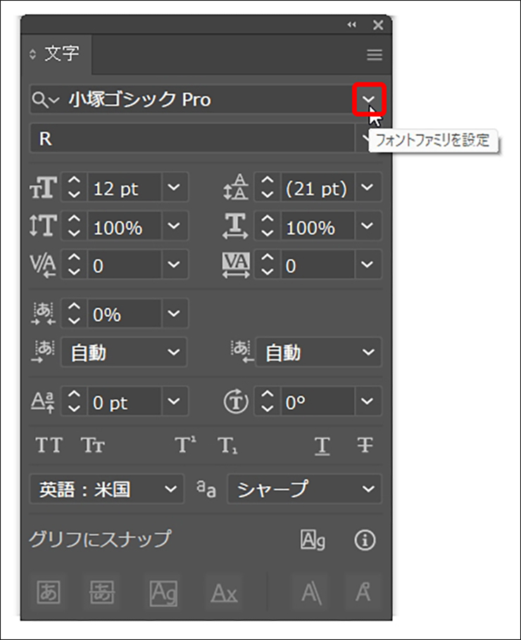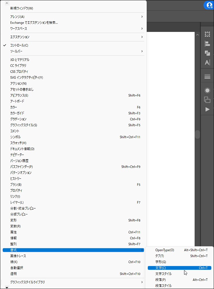 Adobe Fontsでアクティベートしたフォントは、Illustratorの文字パネルに表示されます。文字パネルは、ウィンドウメニュー→“書式”→“文字”を選択すると開くことができます(図12)(図13)。