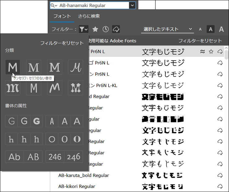 [フィルター]でフォントを検索する際、[分類毎にフォントをフィルター]を使うとフォントの特徴で絞り込んで検索することもできます(図18)(図19)。