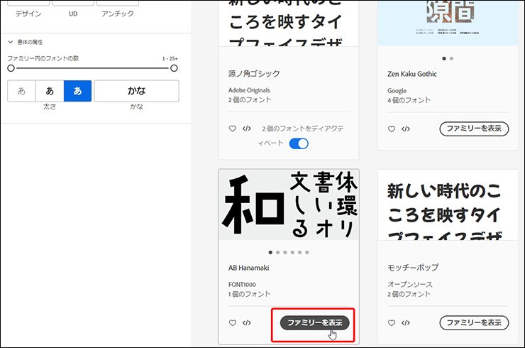 フィルターで選んだ条件に合うフォントだけが一覧表示されるので、その中からイメージに合うフォントを探します。見つかったら[ファミリーを表示]をクリックします(図9)。