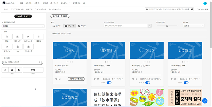 Illustratorにフォントを追加する際によく使われるのがアドビのフォントサービス「Adobe Fonts」です。世界中のフォントメーカーの多彩なフォントが提供されており、次のようなメリットがあります。